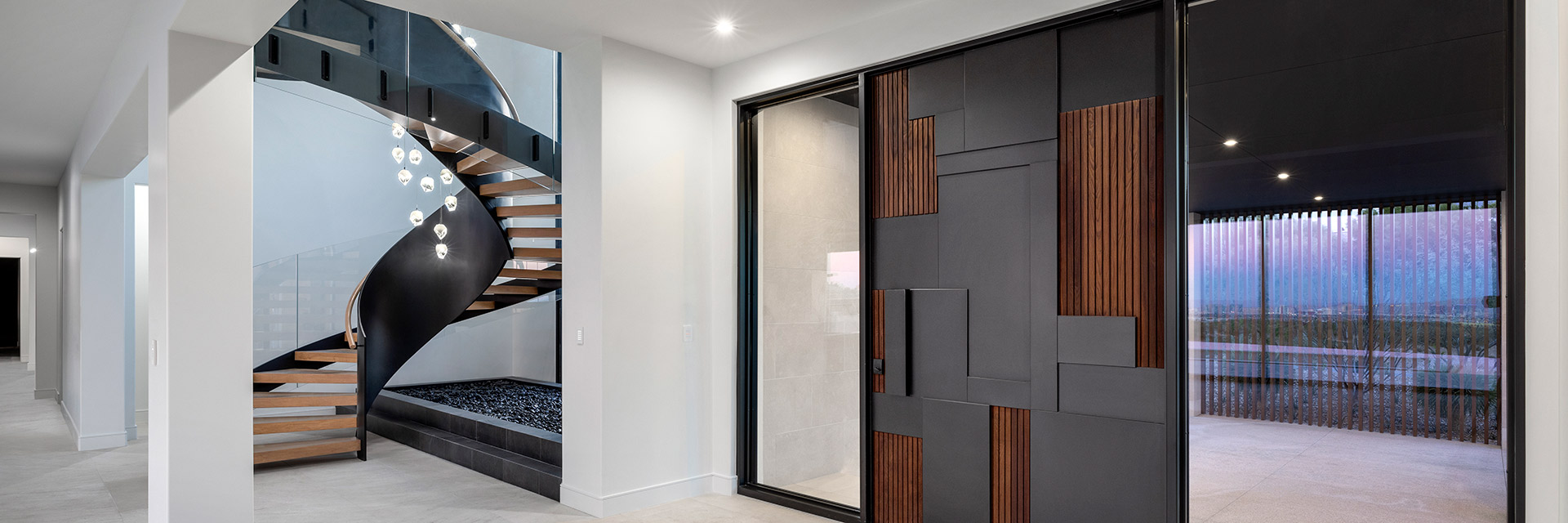 Upon entering this remarkable residence, a striking circular staircase commands attention, its beauty rooted in the harmonious blend of blackened rolled steel, hardwood, and curved glass. The sturdy inner steel stringer rises to form a solid, integrated rail, while the outer glass railing creates a sense of airiness and transparency, balanced by the warmth of the wooden treads and handrail.